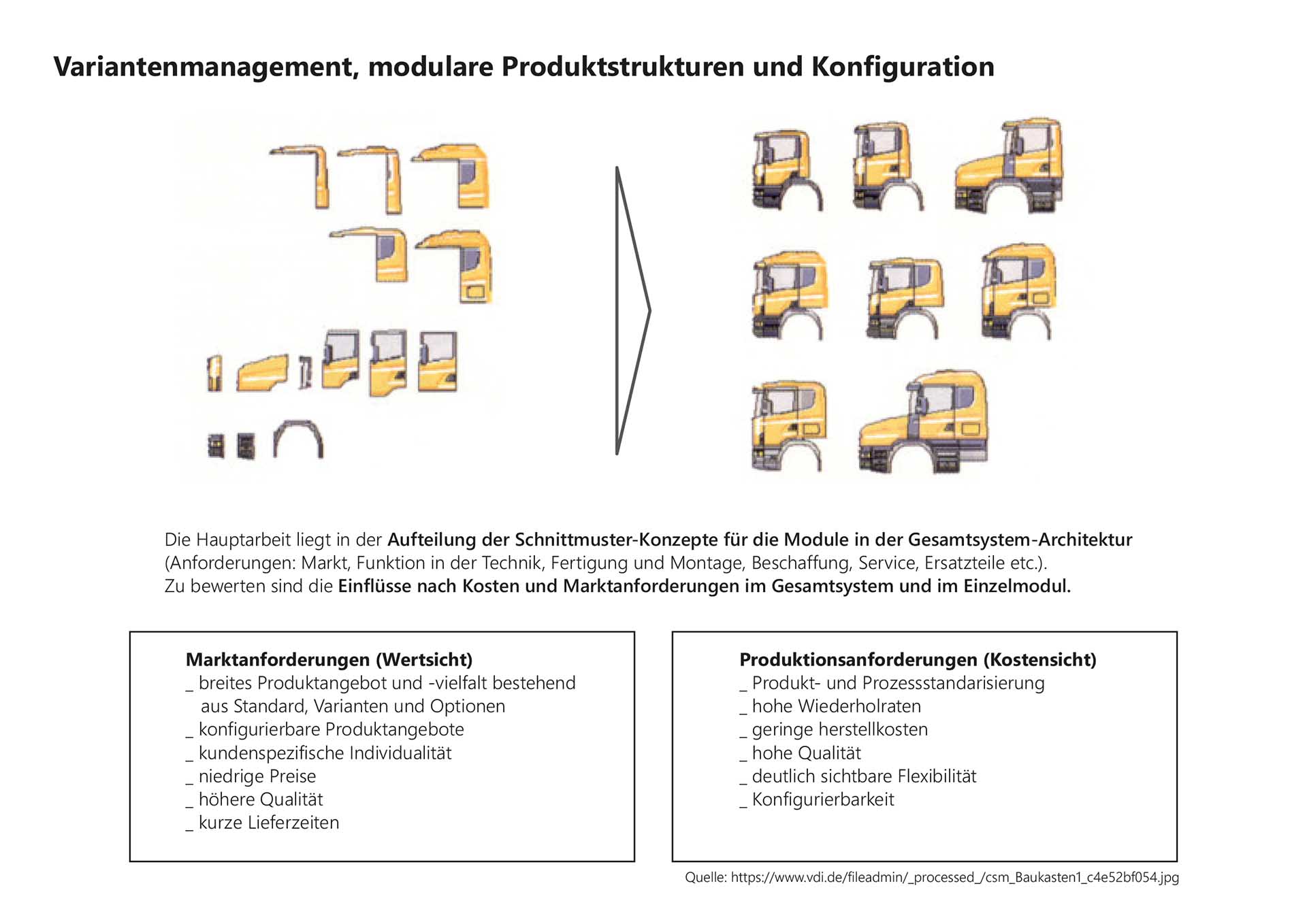 Die Anwendung von Modularisierung zielt darauf ab hochkomplexe Produktreihen zu reduzieren und um einen Überblick über die Vielfalt von Varianten zu ermöglichen.