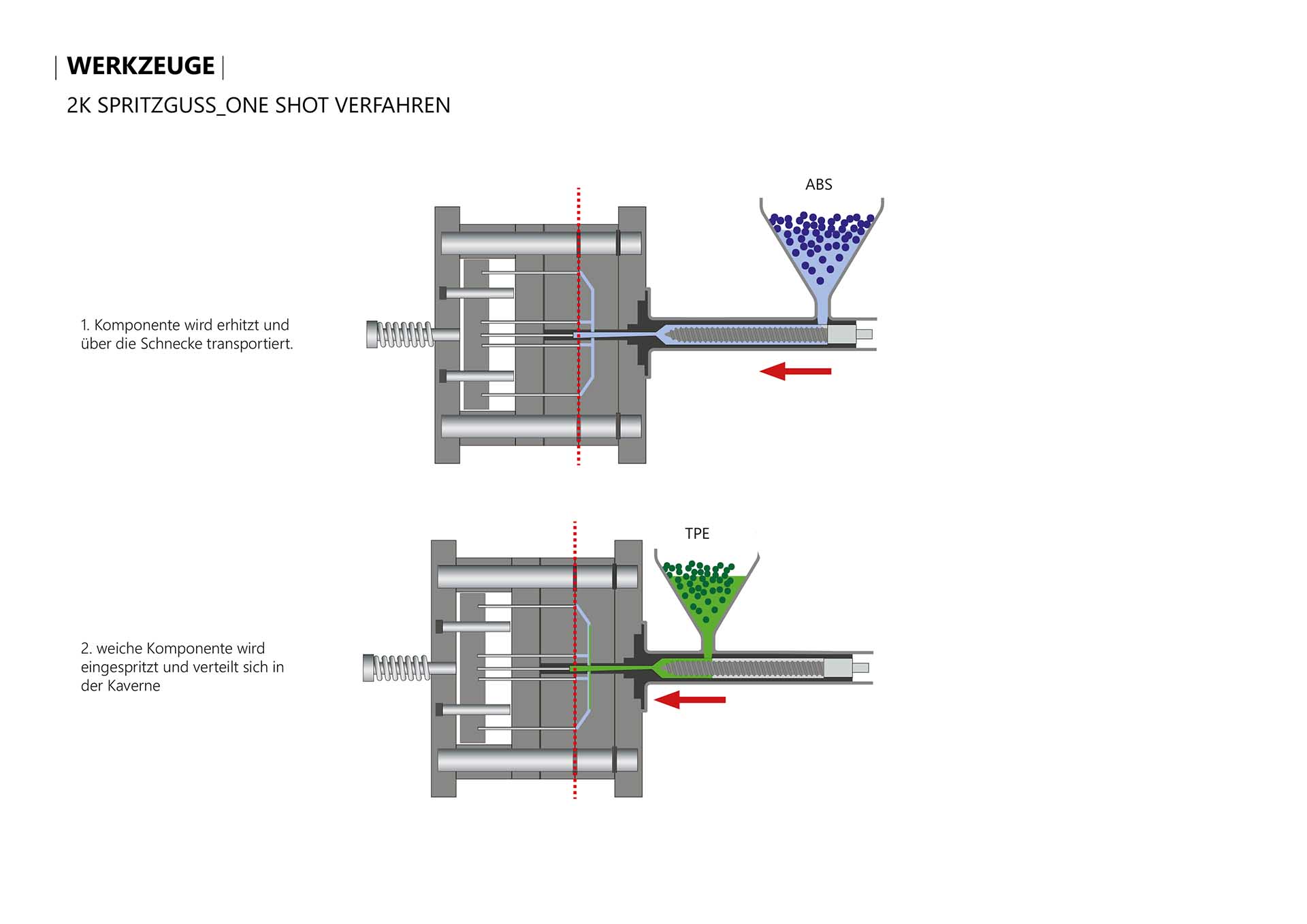 • Einkomponentenwerkzeuge ermöglichen die Herstellung von Formteilen aus einer Kunststoffart. Mit Mehrkomponentenwerkzeugen können Formteile aus mehreren Kunststoffarten und -farben gefertigt werden. Diese werden in einem Arbeitsgang miteinander verbunden, sodass keine sensiblen Übergangsstellen entstehen.