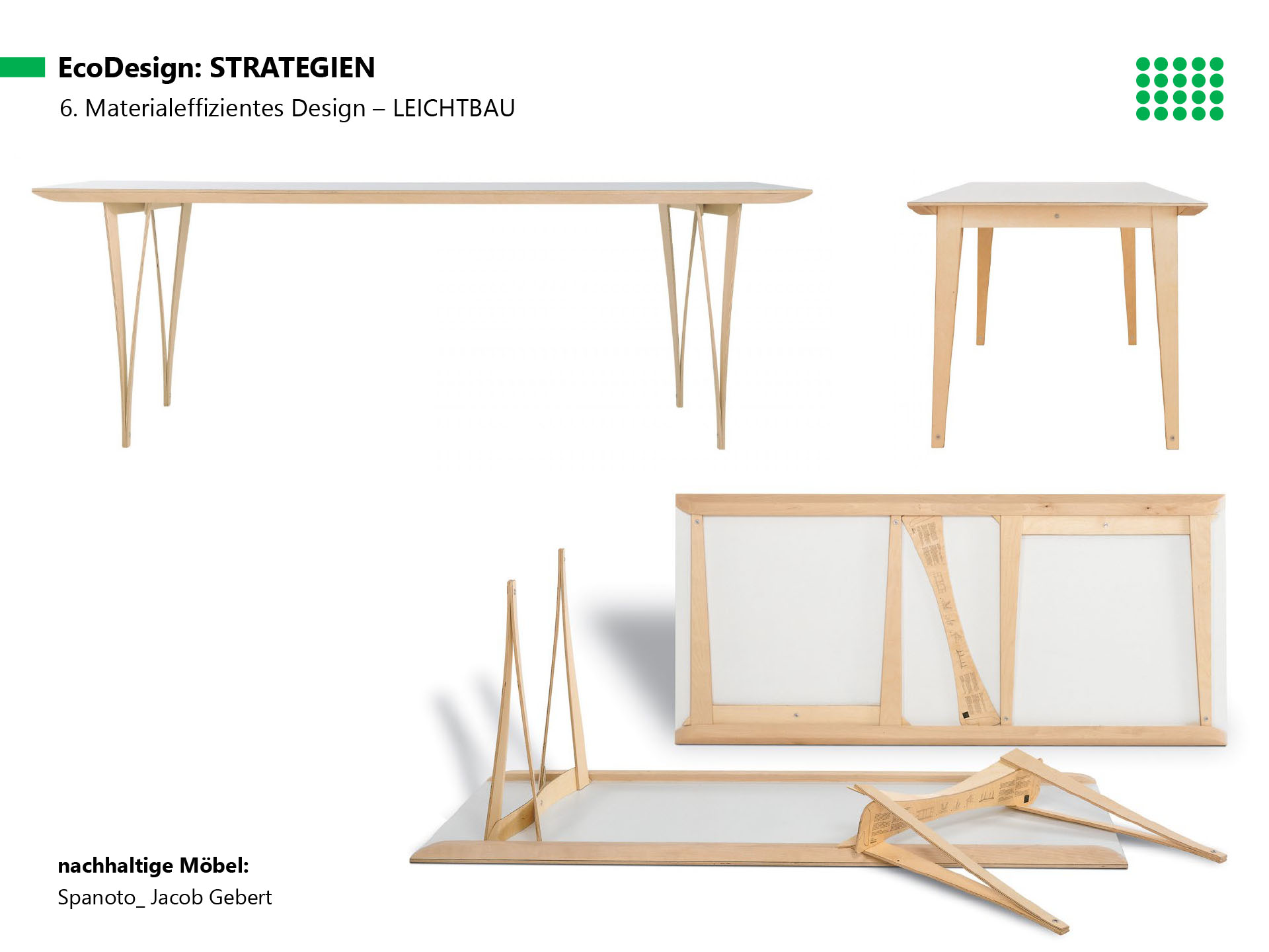 Eco-Design als Designphilosophie behandelt auch Aspekte wie Nutzerverhalten, die Möglichkeit defekte Teile auszutauschen oder zu reparieren und die Haltbarkeit/ Langlebigkeit des Produkts selbst.