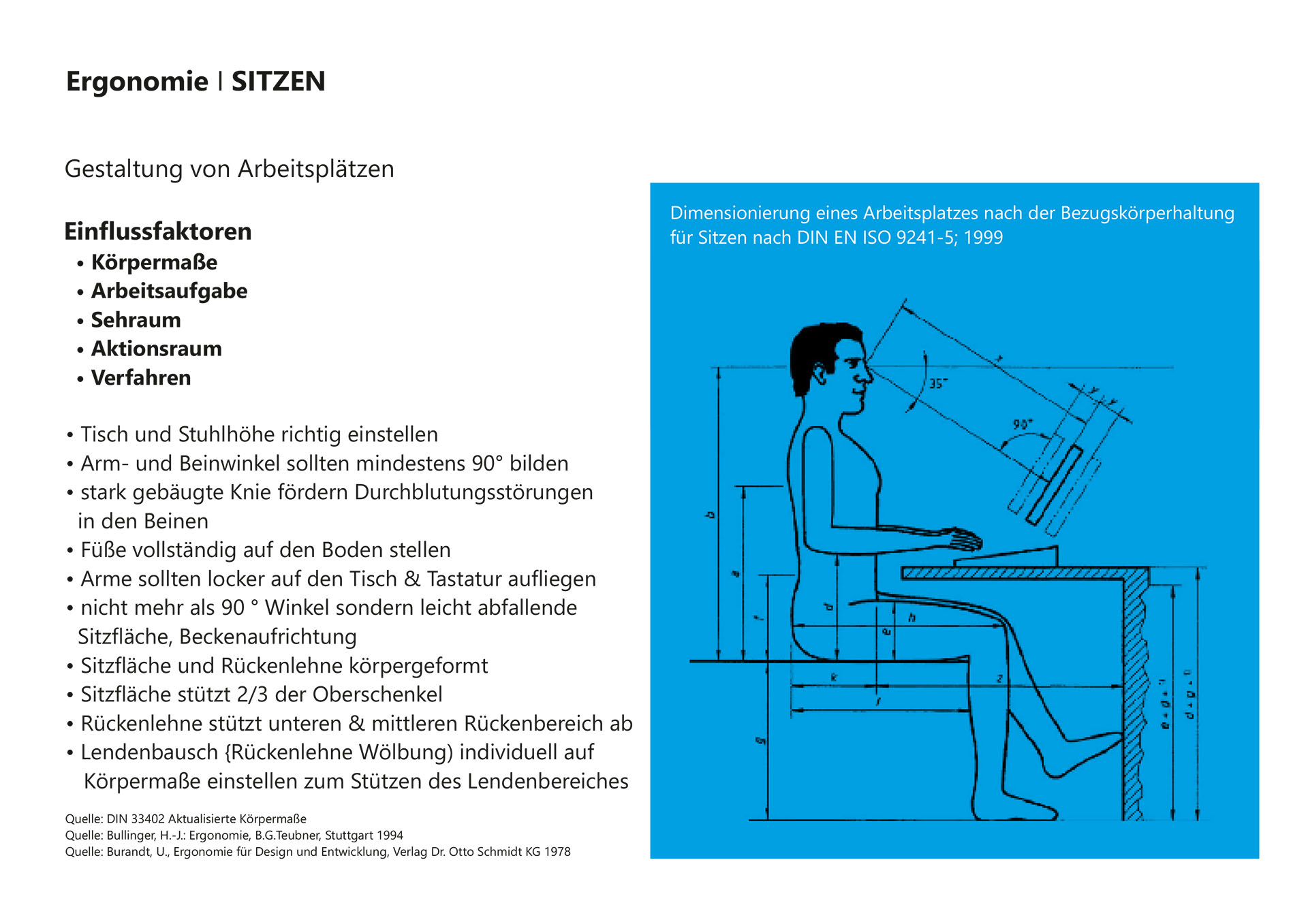 Auch zu beachten ist, um welche Art des Sitzens es sich handeln soll: bequemes Sitzen, aufrechtes und aufmerksames Sitzen, eine Mittelstellung aus Sitzen und Stehen, eine Art von Anlehnen? Welche Art von Arbeit wird sitzend verrichtet? Geht es darum einen Film anzuschauen, bei dem man möglichst nicht einschlafen soll? Ist es kleinteilige, diffizile Arbeit (müssen Ellbogen unterstützt werden?) oder solche, bei der große Bewegungsräume nötig sind, vielleicht sogar verschiedene Sitzhöhen für unterschiedliche Tätigkeiten? Welche Zielgruppe soll den Stuhl benutzen? Geht es um Kinder, bei denen die Sitzgelegenheit mitwachsen soll oder ist die Zielgruppe bereits ausgewachsen? WIe lange soll/muss gesessen werden?