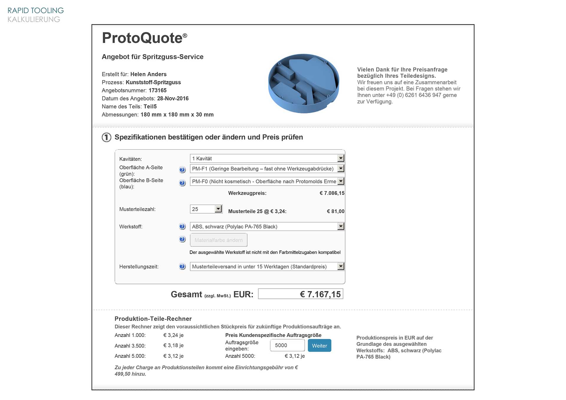 Unter den folgenden Webadressen können Kunststoffpritzgussbauteile in Form von Rapid Tooling Werkzeugen kalkuliert werden. Hierfür sollten möglichst viele Kalkulationen von verschiedenen Anbietern eingeholt werden, um eine möglichst kostengünstiges Angebot zu finden:
