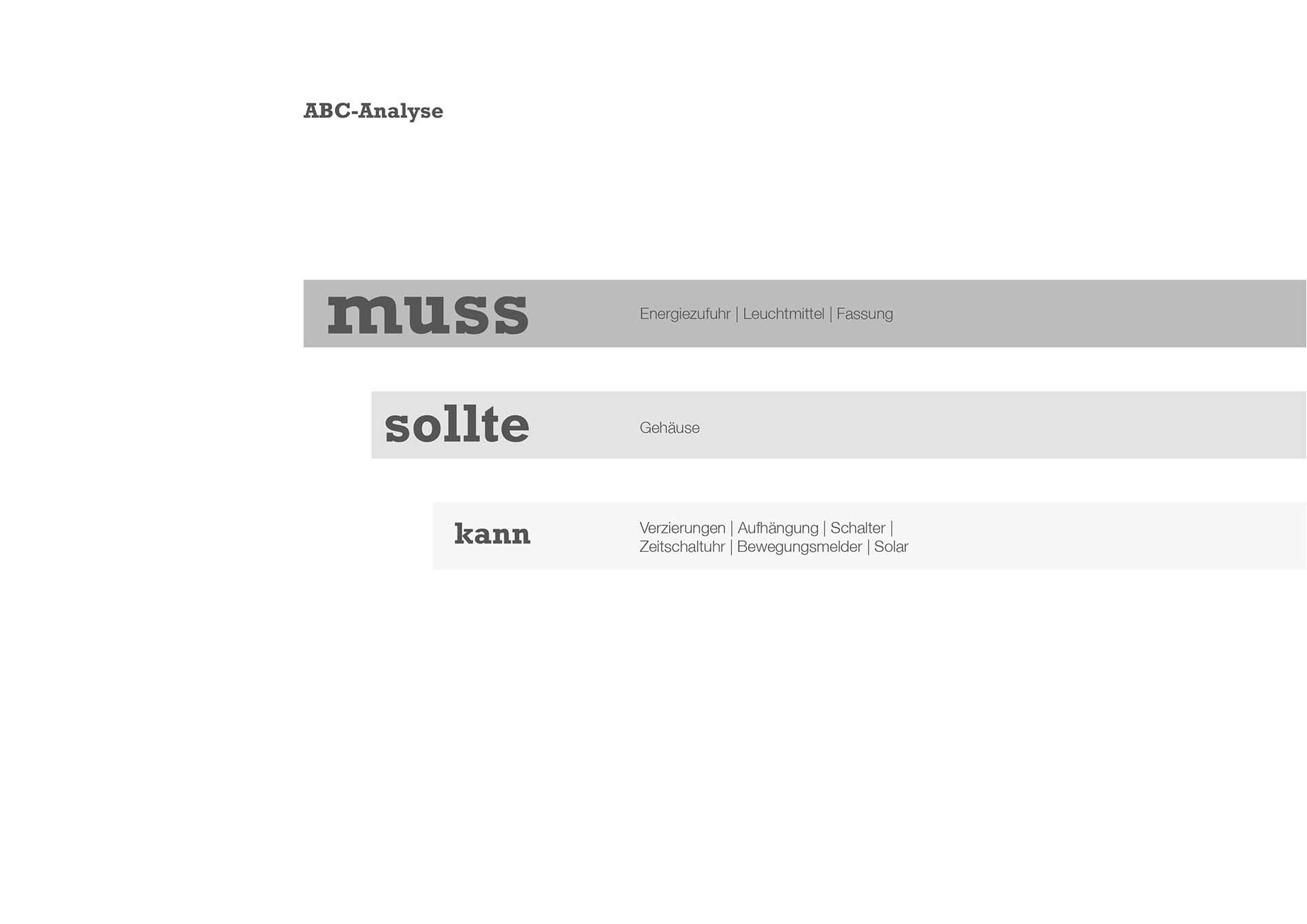 Ziel der ABC – Analyse ist es, mit den 3 Kategorien alle zufriedenstellenden Eigenschaften, des jeweiligen Produktes, zu erfassen.