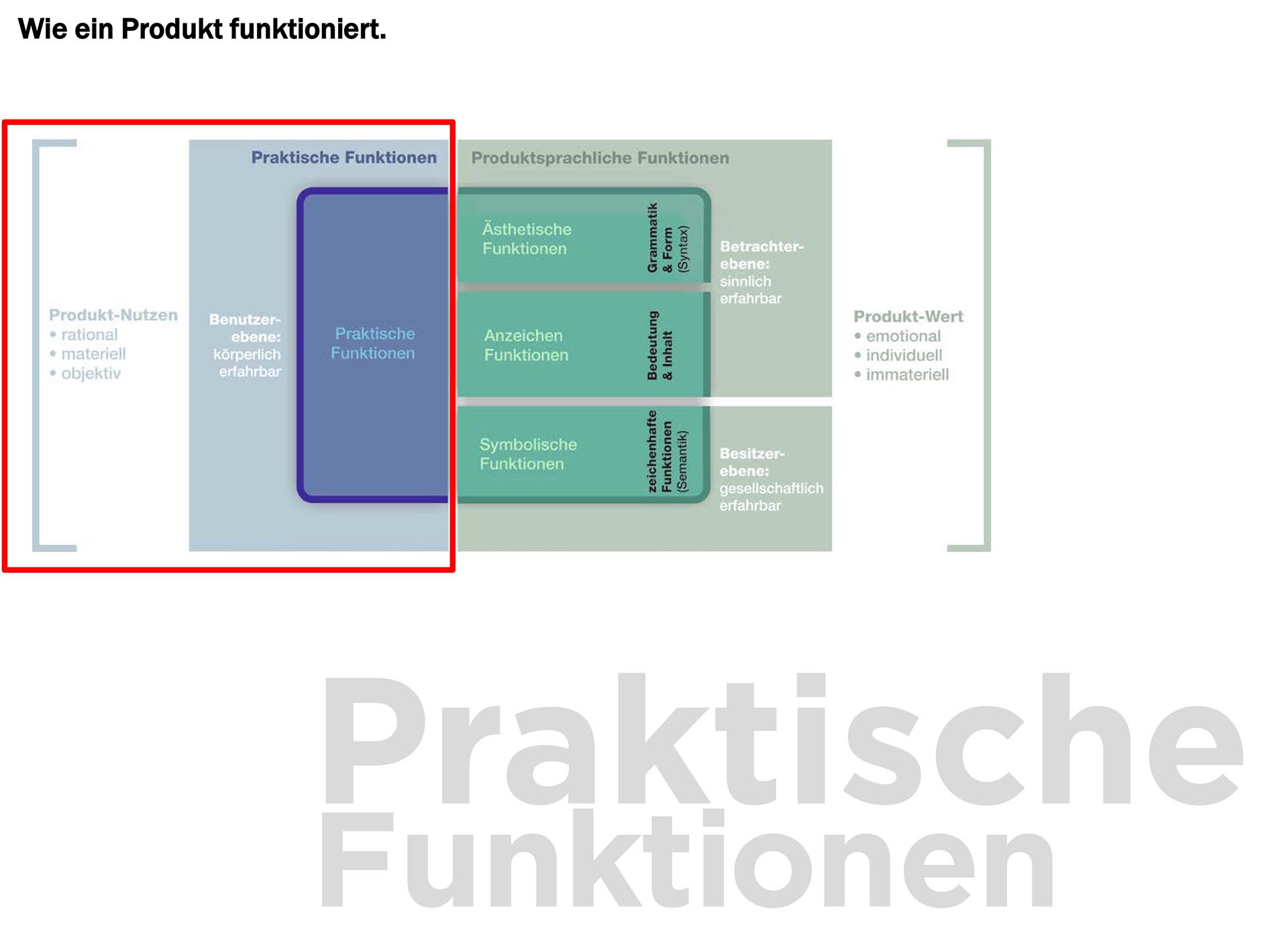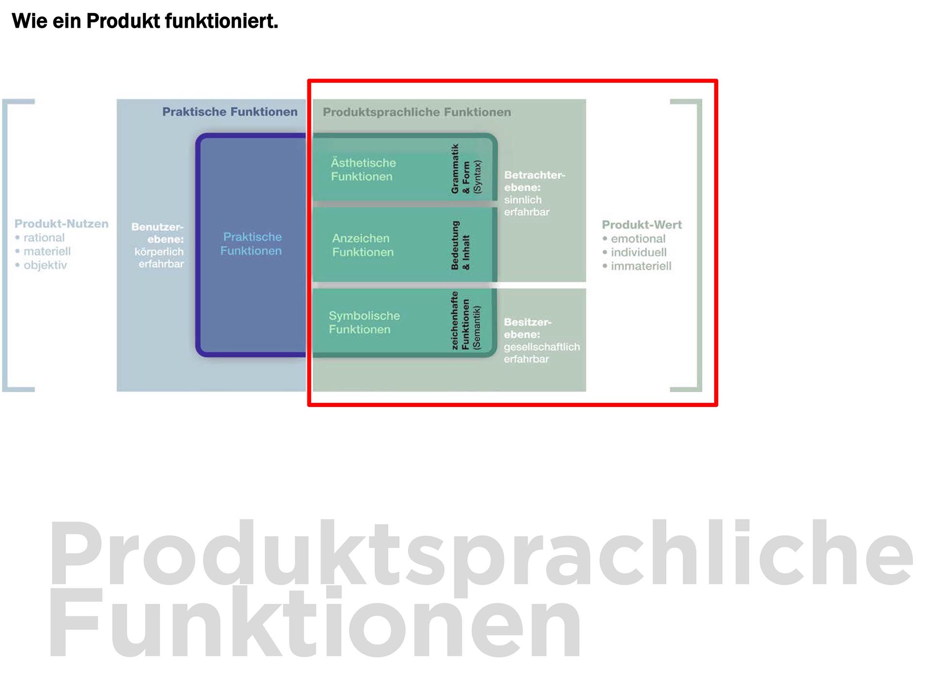 Produktsprache wird eingesetzt, um Geschichten und Wirkungen auf mehreren Ebenen zu vermitteln und um unterschiedliche Zwecke zu erfüllen. Daher beinhaltet sie mehrere Funktionen: