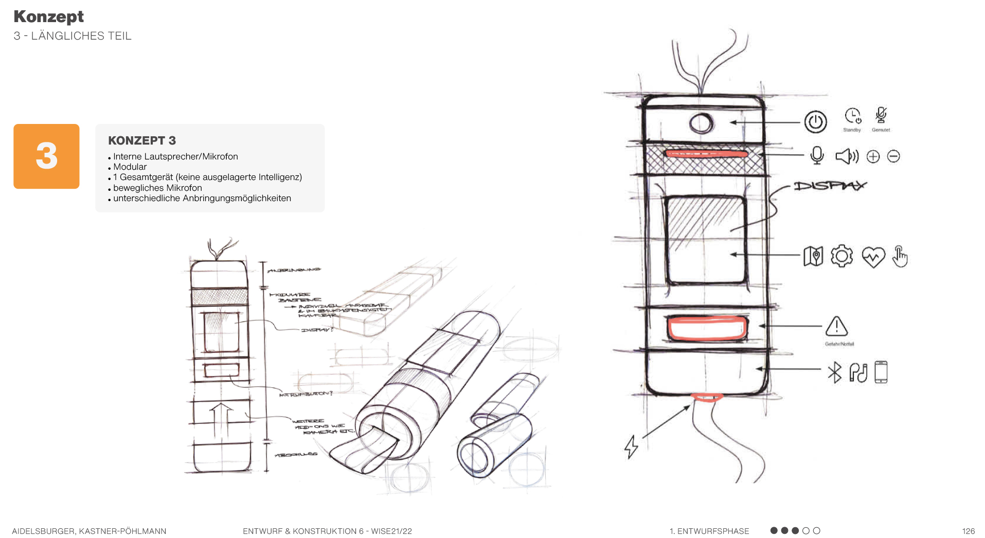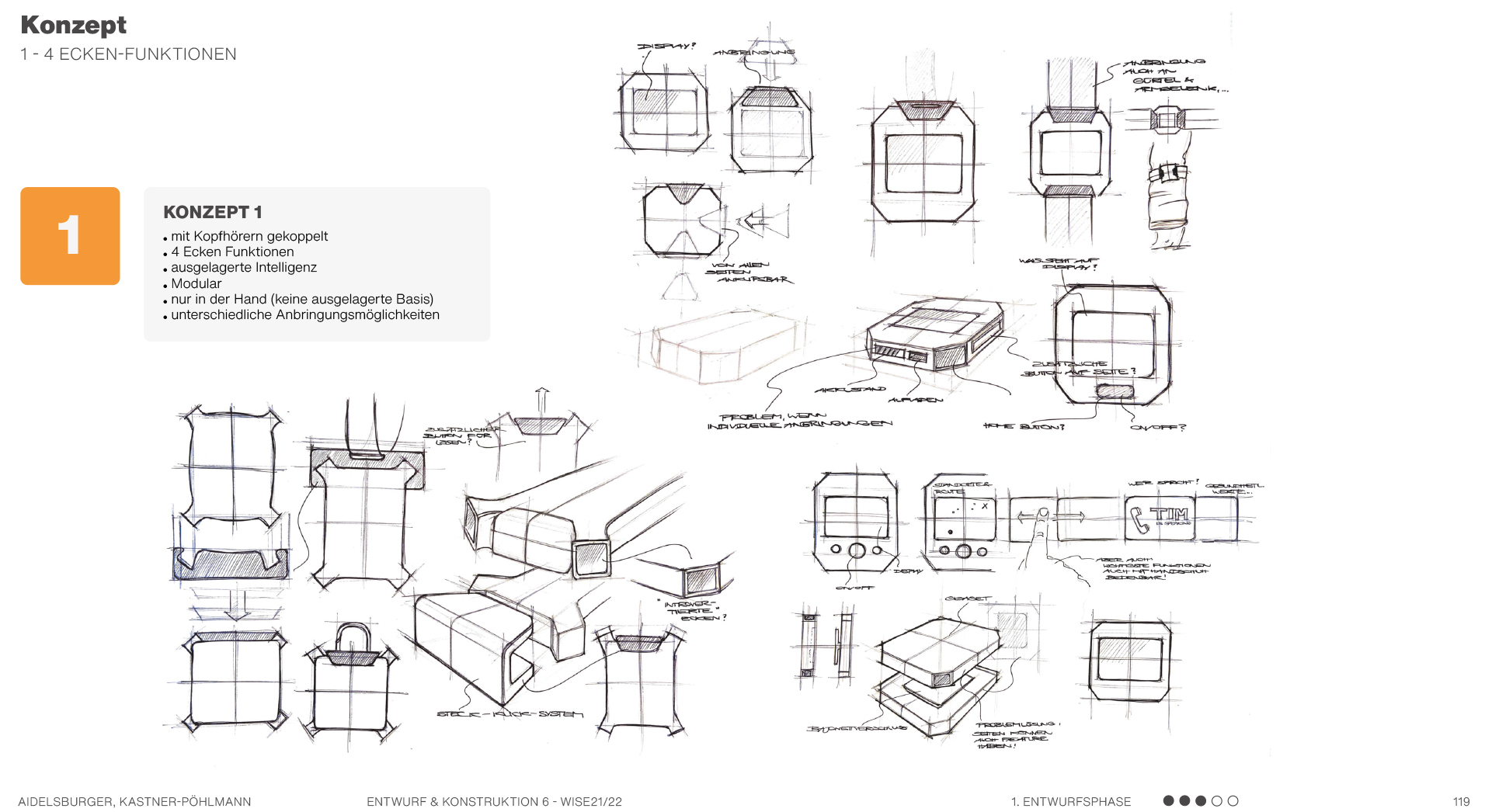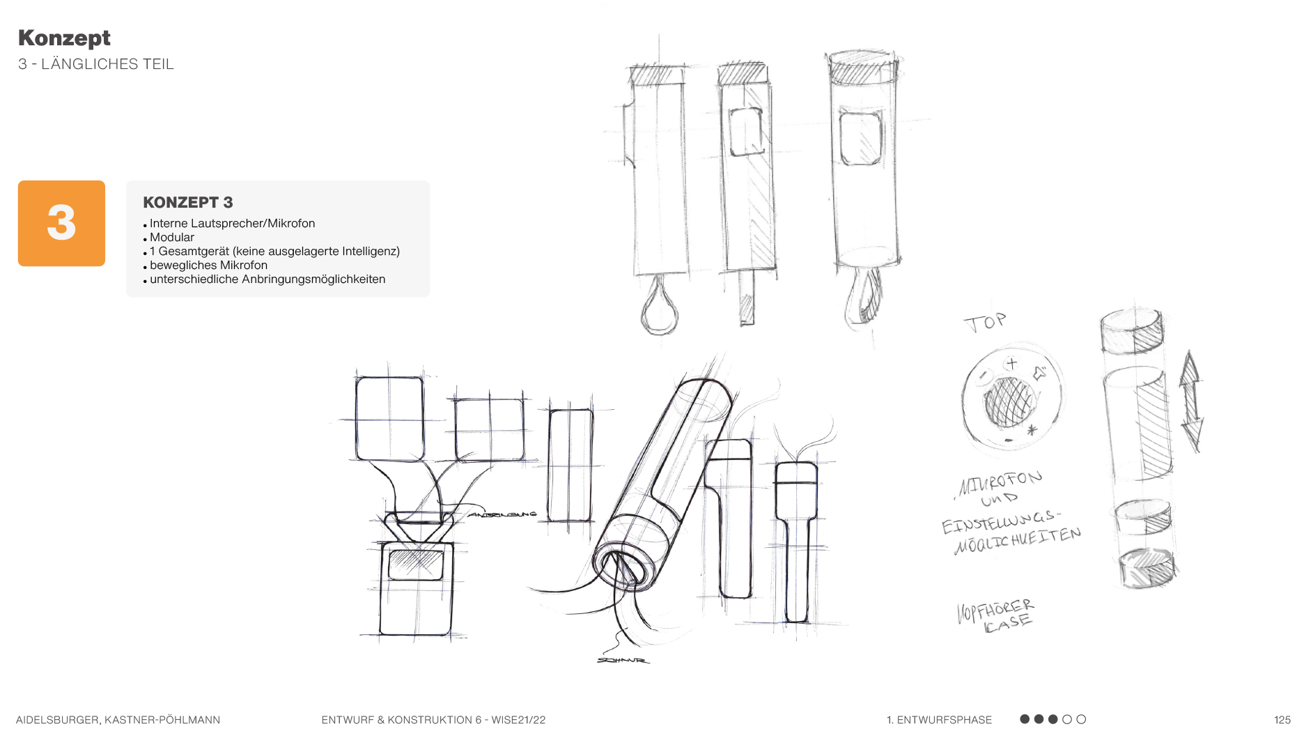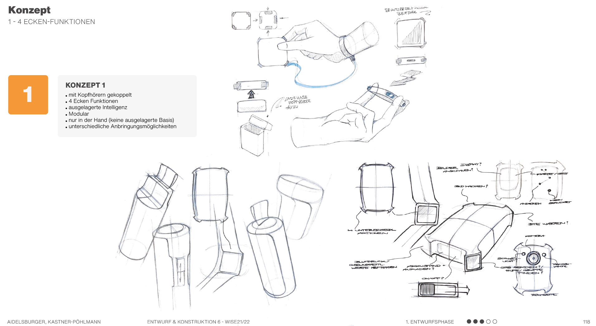 Beispielsweise solche, die sich auf Formen beziehen, also Formkonzepte, die die Produktgestalt näher beschreiben und teilweise ausarbeiten. Es werden mehrere mögliche Formen anhand von Scribbles und kurzen Erklärungssätzen dargestellt. Hier geht es hauptsächlich um die äußere Form des Produktes und die Ergonomie. Am Ende kann man dann in einer Übersicht erkennen, welche Formen weiter ausgearbeitet werden können und welche Entwürfe eher ungeeignet sind.