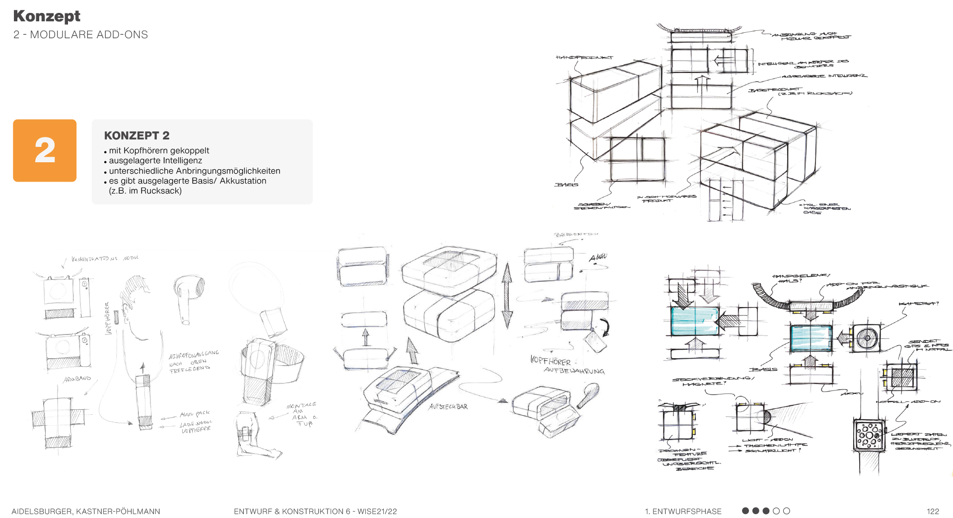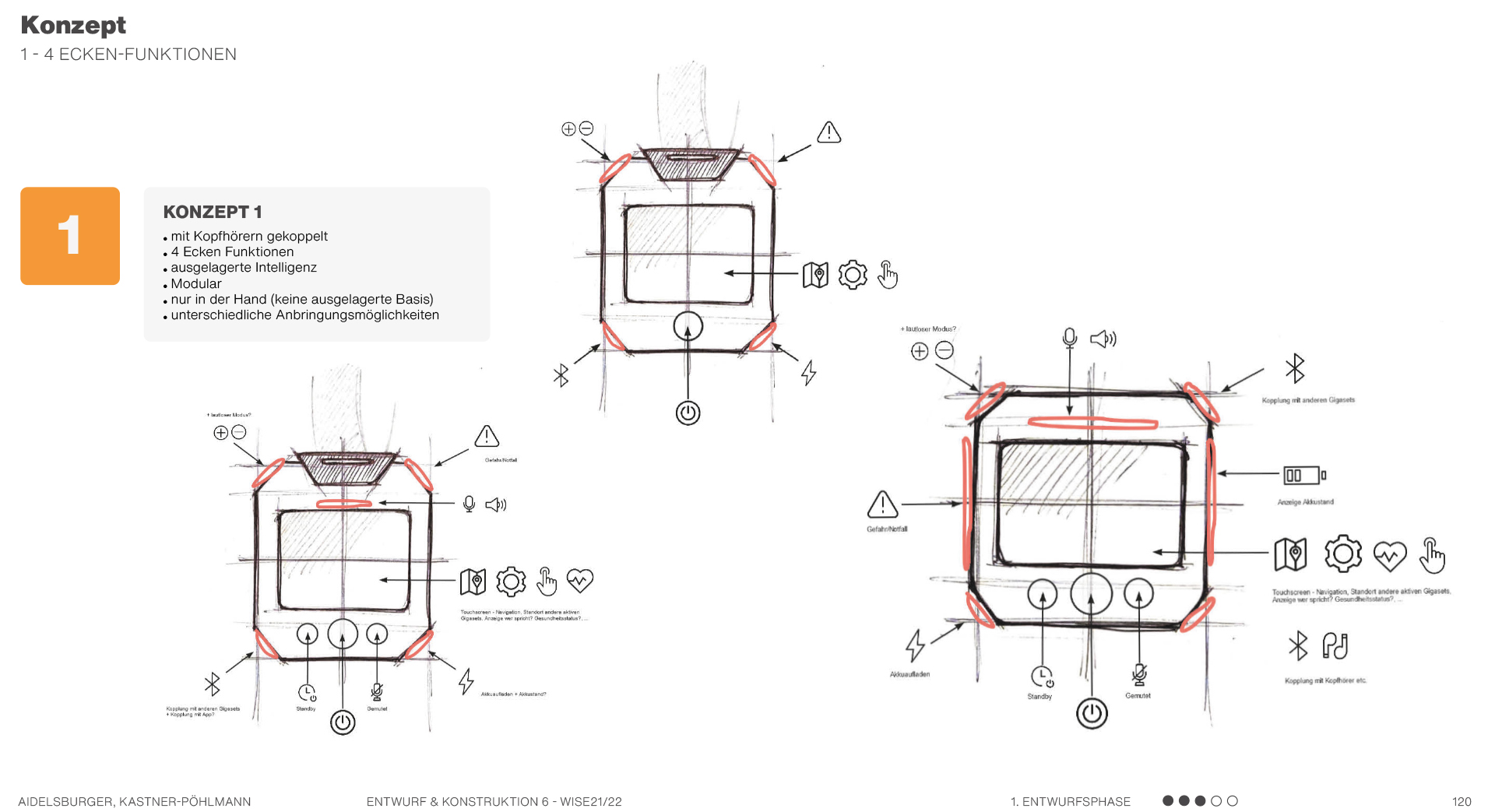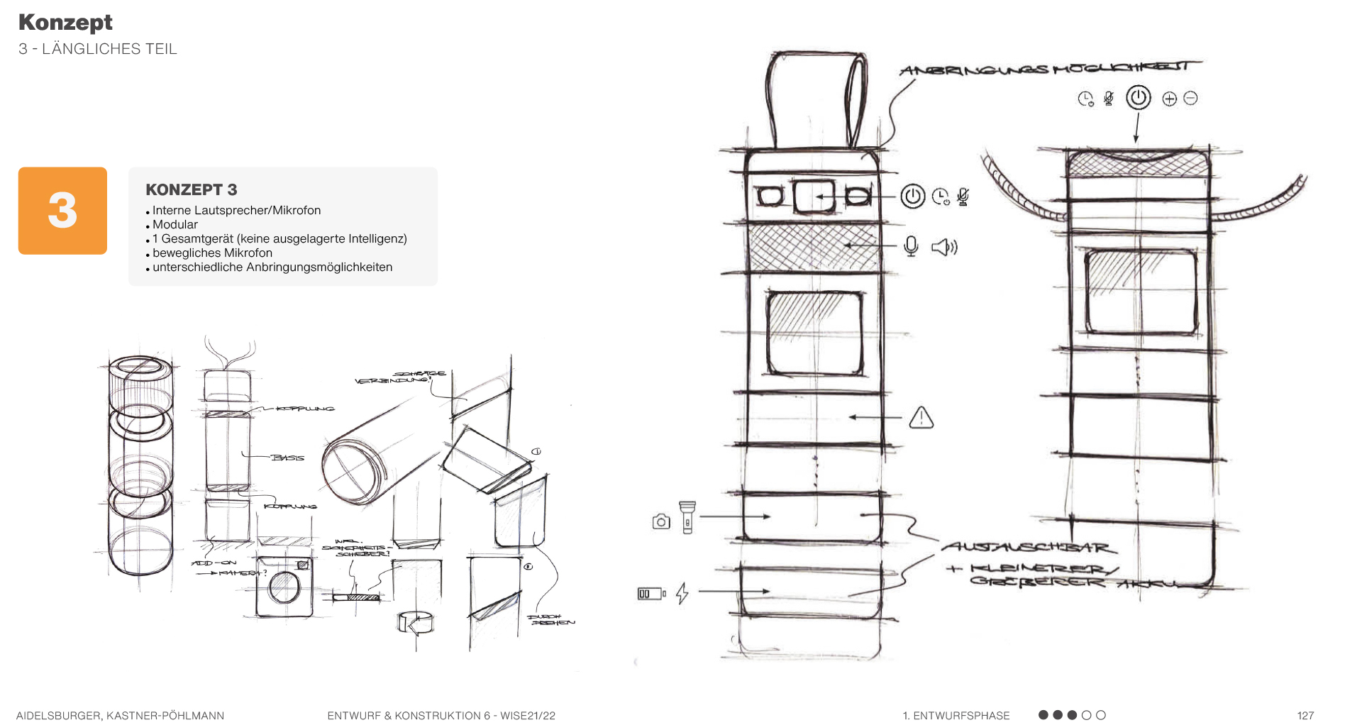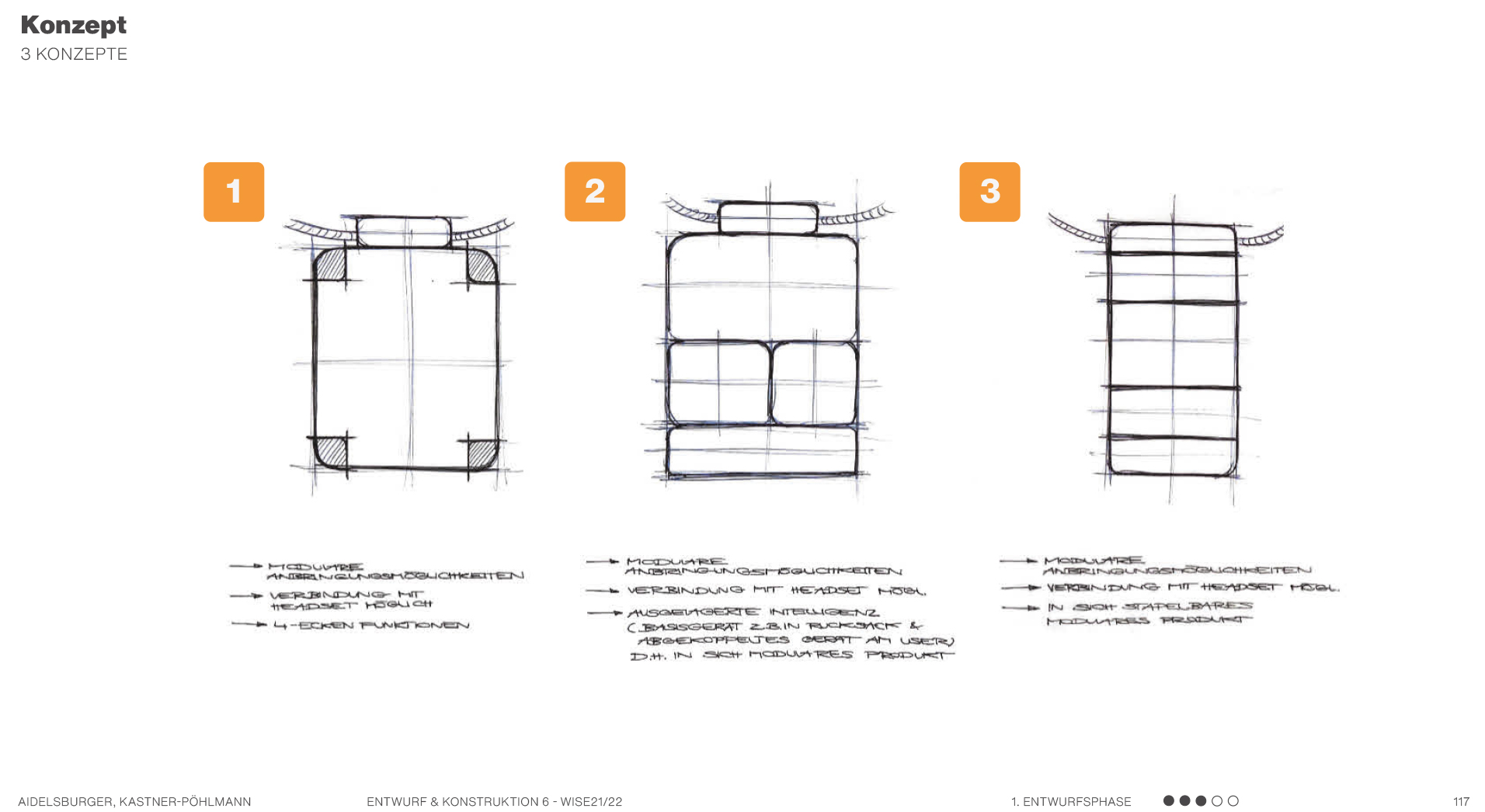 Beispielsweise solche, die sich auf Formen beziehen, also Formkonzepte, die die Produktgestalt näher beschreiben und teilweise ausarbeiten. Es werden mehrere mögliche Formen anhand von Scribbles und kurzen Erklärungssätzen dargestellt. Hier geht es hauptsächlich um die äußere Form des Produktes und die Ergonomie. Am Ende kann man dann in einer Übersicht erkennen, welche Formen weiter ausgearbeitet werden können und welche Entwürfe eher ungeeignet sind.