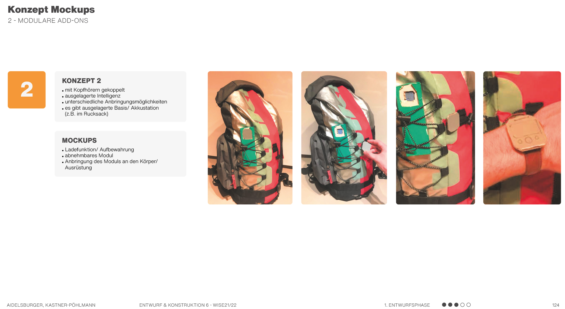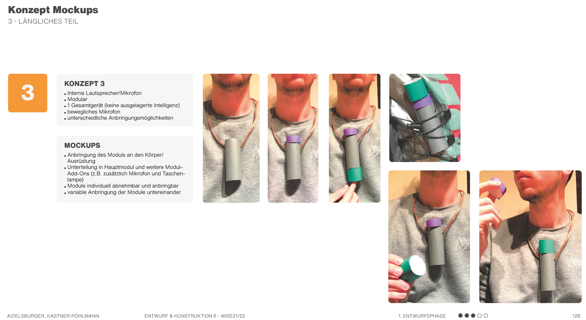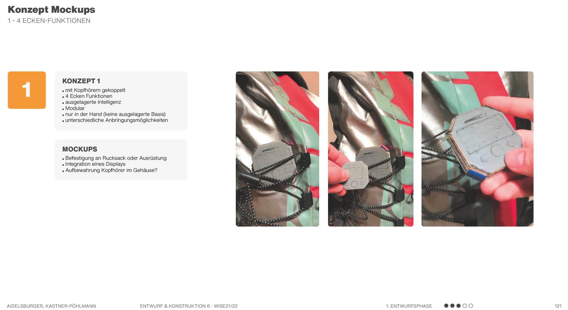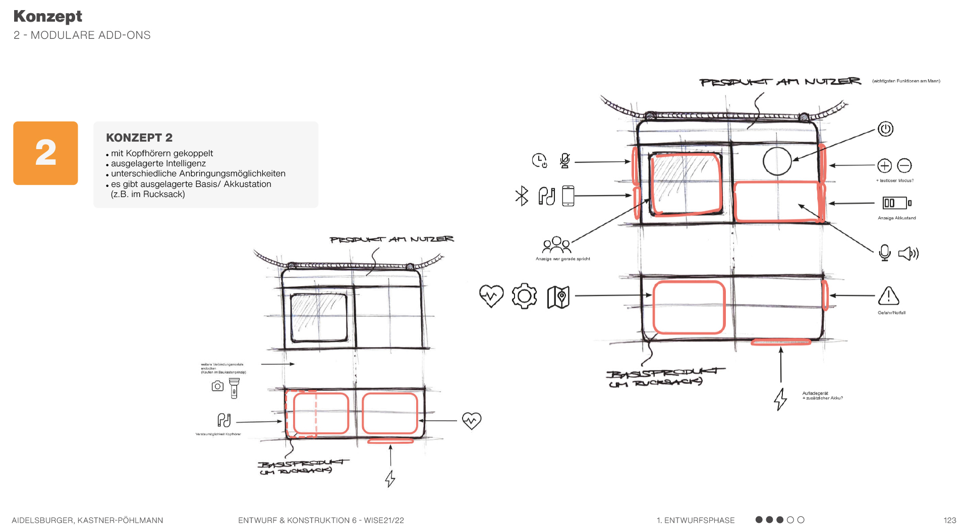 Beispielsweise solche, die sich auf Formen beziehen, also Formkonzepte, die die Produktgestalt näher beschreiben und teilweise ausarbeiten. Es werden mehrere mögliche Formen anhand von Scribbles und kurzen Erklärungssätzen dargestellt. Hier geht es hauptsächlich um die äußere Form des Produktes und die Ergonomie. Am Ende kann man dann in einer Übersicht erkennen, welche Formen weiter ausgearbeitet werden können und welche Entwürfe eher ungeeignet sind.